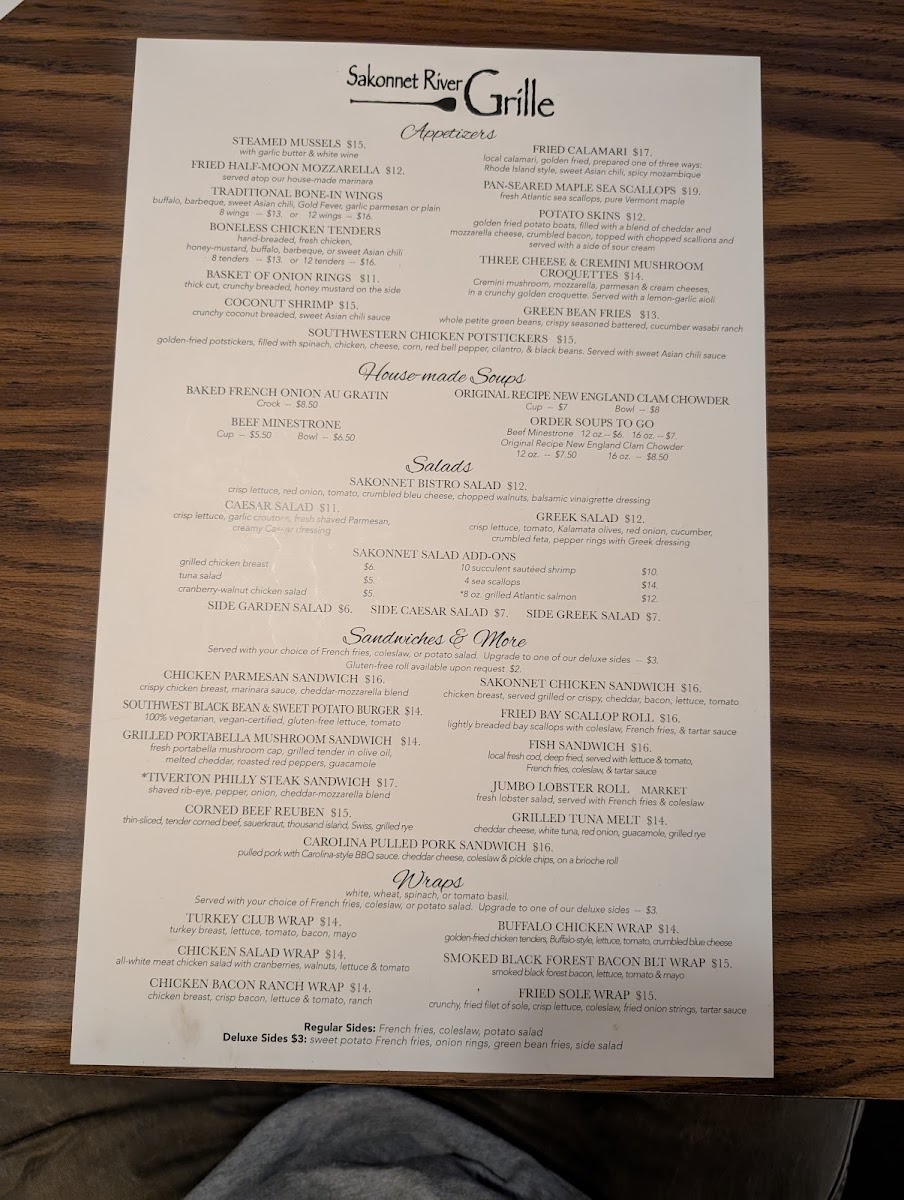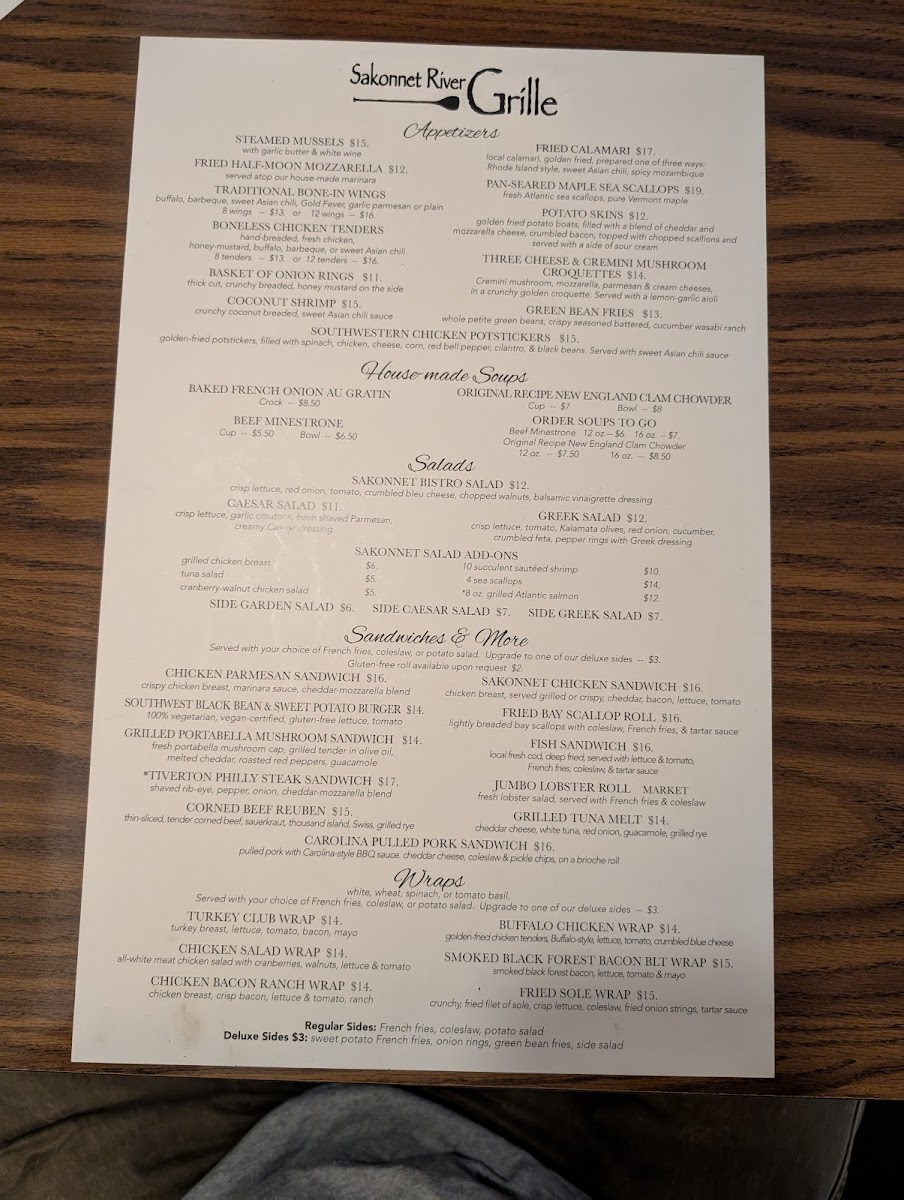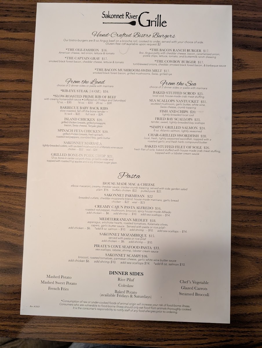 The dedicated staff, like the friendly Fernanda and the attentive Kristin, contribute to the restaurant's relaxed atmosphere, ensuring every guest feels welcomed and valued. Whether you're celebrating a special occasion or simply enjoying a meal with family and friends, Sakonnet River Grille delivers a memorable dining experience. The diverse menu, featuring an array of appetizers, sandwiches, and entrées, caters to all tastes, making it a must-visit destination for food lovers in the area.